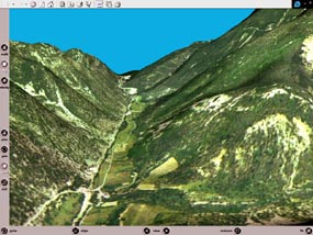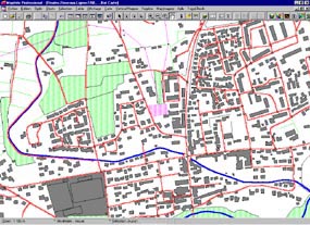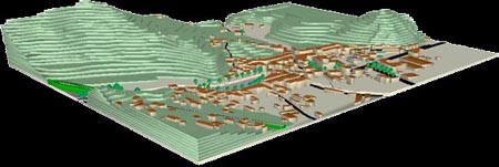 The structuring parts of the virtual environment are generated by a GIS, using databases (tographic, construction, networks, ground use, ...). The GIS can be used to provide thematic information, toponymy, symbologic mark point, graphs, etc .... |